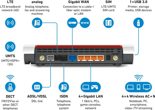 Met de FRITZ!Box 6890 LTE router zit je nooit meer zonder internet. Deze router heeft namelijk een ingebouwd DSL modem én ruimte voor een sim kaart. Zo schakelt deze router automatisch over naar het 4G netwerk als je vaste verbinding uitvalt. Dankzij het simkaartslot gebruik je de router ook op plekken waar je geen vaste internetverbinding hebt, zoals een pop-up store of een huis in het buitengebied. De router voorziet je van een snelle wifi verbinding die dankzij MU-MIMO bovendien ook stabiel blijft als er veel apparaten verbonden zijn. Zo stream je 4K films over je thuisnetwerk. Deze FRITZ!Box is naast router ook een complete telefooncentrale. Sluit 2 bekabelde toestellen aan of gebruik het ingebouwde DECT basisstation om je telefoons te verbinden.