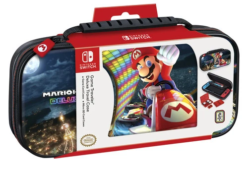 Met de Nintendo Switch Travel Case Mario Kart neem je jouw nieuwe Nintendo Switch in stijl mee op reis. Ben je onderweg klaar met spelen? Dan berg je jouw Switch op in deze gevoerde Mario Kart 8 hoes. Hierdoor is de Switch ook in je tas veilig tegen krassen, stoten en vuil. Naast de Switch is er ook een opbergvak met 2 hoesjes met ruimte voor 8 game cartridges en 2 hoesjes met ruimte voor 4 sd kaarten. Zo heb je altijd je favoriete games bij de hand. Wanneer je geen tas bij je hebt draag je deze travel case eenvoudig aan het handvat met je mee zodat iedereen weet dat jij de eindbaas van de Rainbow Road bent.