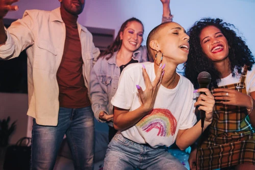 Door de meegeleverde microfoon zingen jij en je vrienden mee met de muziek.