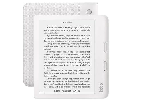 Je bladert comfortabel door je favoriete boeken met de Kobo Libra 2 Wit. Dankzij de ergonomische handgreep houd je de e-reader gemakkelijk langere tijd vast. Met de fysieke knoppen op de handgreep sla je eenvoudig een pagina om. Met een gewicht van 215 gram weegt de Kobo Libra 2 bovendien minder dan een gemiddeld A5 notitieblok. Zo neem je de e-reader gemakkelijk overal mee naartoe. Je leest zelfs op het strand of aan het zwembad, want de Libra 2 heeft een waterdichte behuizing. Kobo heeft ook aan het comfort van je ogen gedacht. Het 7 inch scherm filtert namelijk blauw licht en past de helderheid en kleurtemperatuur automatisch aan op basis van je omgevingslicht. Dankzij bluetooth ondersteuning luister je met je Libra 2 ook naar luisterboeken die je via de Kobo Store aanschaft of leent via een Kobo Plus abonnement.