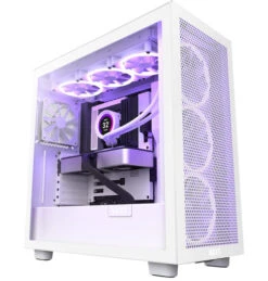 Plaats al je componenten in de NZXT H7 Flow RGB – White – 2023 Model mid-tower computerbehuizing. Zo stel je jouw gedroomde ATX, Micro-ATX of Mini-ITX setup samen. Bij deze case krijg je 3 F140 RGB Core ventilatoren van 140 millimeter en een F120Q ventilator van 120 millimeter. De F140 RGB Core ventilatoren installeer je achter het frontpaneel en geef je jouw favoriete kleuren door de RGB ondersteuning. De gegaasde top- en frontpanelen van de kast zorgen voor een extra goede luchtstroom. Hierdoor blijven je componenten goed gekoeld en is warme lucht snel weer uit de kast. Veel gedoe met kabels? Geen probleem. Met het kabelmanagement in de kast houd je al je kabels netjes bij elkaar. Daarnaast open je de kast zonder gereedschap, waardoor je altijd gemakkelijk een nieuw component erin prikt.