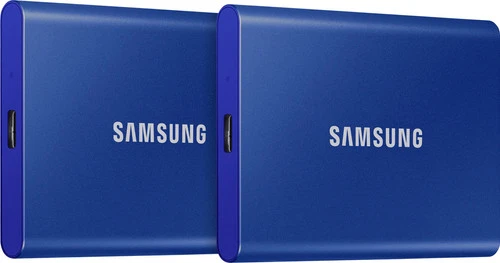 Zet je bestanden razendsnel over met de Samsung Portable SSD T7 500GB Blauw – Duo Pack. Deze bundel bevat 2 snelheidsduivels met ieder een opslagcapaciteit van 500 gigabyte. Zo neem je jouw hele film- en fotocollectie mee, of maak je backups in het geval één van de schijven kapot gaat. De T7 is 2 keer sneller dan zijn voorganger, de T5. Met een leessnelheid van 1050 MB/s en schrijfsnelheid van 1000 MB/s zet je een 4K film van 50 gigabyte in minder dan een minuut op de SSD. De SSD’s zijn slechts 8,5 centimeter lang en wegen 58 gram per schijf. Zo neem je ze gemakkelijk mee in je tas of jaszak. De metalen behuizing en valbestendigheid tot 2 meter zorgen ervoor dat deze SSD’s tegen een stootje kunnen. Bijvoorbeeld wanneer ze uit je zak vallen. De T7 SSD’s werken op vrijwel ieder apparaat met een usb A of usb C poort.