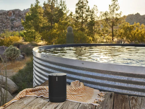Hang de speaker ook buiten dankzij het roestvrije aluminium materiaal en de IP56-certificering.